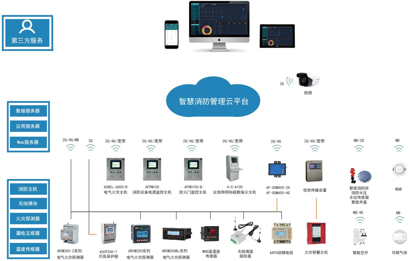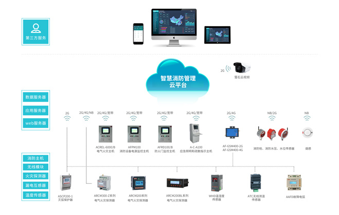 智慧消防管理云平臺(tái)包含了智慧用電子系統(tǒng)、防排煙子系統(tǒng)、消防水子系統(tǒng)、消防設(shè)備電源子系統(tǒng)、防火門(mén)子系統(tǒng)、應(yīng)急照明和疏散指示子系統(tǒng)、消防設(shè)備管理子系統(tǒng)和視頻監(jiān)控子系統(tǒng)等。