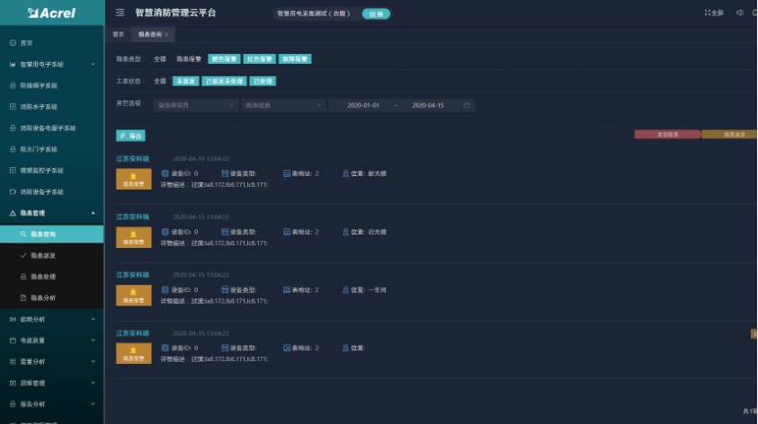隱患管理功能包括了隱患查詢、隱患派發(fā)、隱患處理和隱患分析四個(gè)模塊。可以查看登錄用戶下的所有項(xiàng)目的隱患信息,并進(jìn)行派發(fā)和處理操作,且對(duì)所有隱患進(jìn)行統(tǒng)計(jì)分析。