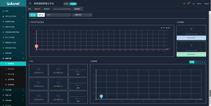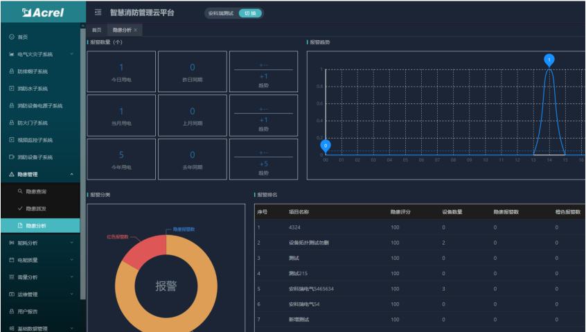 智慧用電子系統(tǒng)可以接入電氣火災(zāi)、故障電弧、電氣火災(zāi)主機(jī)、滅弧式保護(hù)器探測(cè)器和無(wú)線測(cè)溫探測(cè)器等。點(diǎn)擊智慧用電子系統(tǒng)進(jìn)入智慧用電監(jiān)控頁(yè)面,點(diǎn)擊***顯示整個(gè)項(xiàng)目的基礎(chǔ)信息和該項(xiàng)目下的所有探測(cè)器的信息,點(diǎn)擊末*節(jié)點(diǎn)顯示具體探測(cè)器的監(jiān)控頁(yè)面。