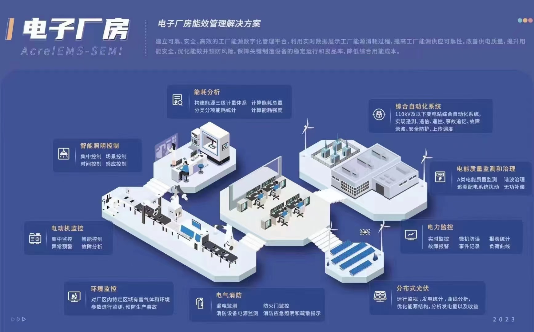 AcrelEMS-SEMI電子廠房能效管理平臺集變電站綜合自動化、電力監(jiān)控、電能質量分析及治理、電氣安全、能耗分析、照明控制、設備運維于一體,為建立可靠、安全的工廠能源管理體系提供數據支持。同時引入先進技術,配合廠務系統(tǒng)*化,簡化全廠管理,并利用實時數據,提高能效并預防風險,保障關鍵制造設備的穩(wěn)定運行和良品率,降低綜合成本。