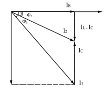 如圖2,當未接電容C時,流過電感L的電流為IL,,流過電阻R的電流為IR,電源供給的電流為I1,I1=IR+jIL,此時相位角為Φ1,功率因數為COSΦ1;并聯接入電容C后,由于電容電流IC與電感電流IL方向相反,使得電源供給電流由I1減小為I2,I2=IR+j(IL-IC),相角由Φ1減小到Φ2,功率因數由COSΦ1提高到COSΦ2。