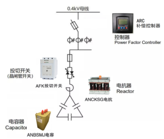 ANSVC無功補償裝置適用于頻率50Hz電壓0.4KV的系統中,ANSVC低壓無功功率補償裝置并聯在整個供電系統中,能根據電網中負載功率因數的變化控制電力電容器投切進行補償。其原理為:ANSVC低壓無功功率補償裝置通過CT采集電流、電壓信號,由無功補償控制器計算,計算出投切電容器的方案,通過投切開關控制各組電力電容器投切。