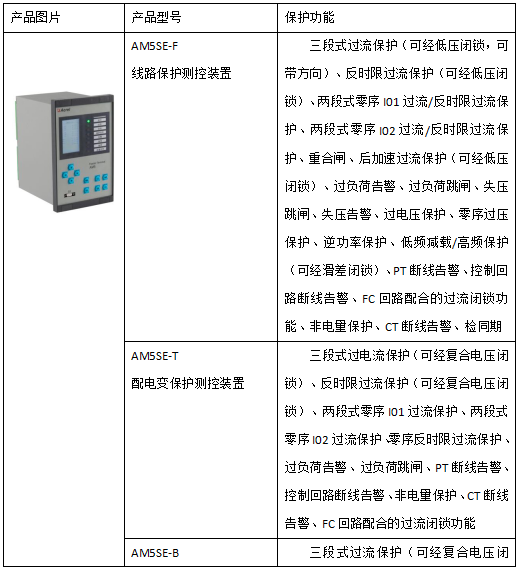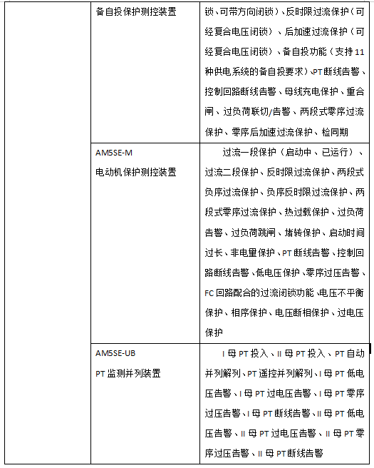 根據10kV廠用電母線所接設備負荷性質的不同,進線柜采用AM5SE-F線路保護測控裝置、變壓器柜采用AM5SE-T配電變保護測控裝置、電動機柜采用AM5SE-M電動機保護測控裝置、母聯柜采用AM5SE-B備自投保護測控裝置、PT柜采用AM5SE-UB PT監測并列裝置,各型號保護功能如下表所示: