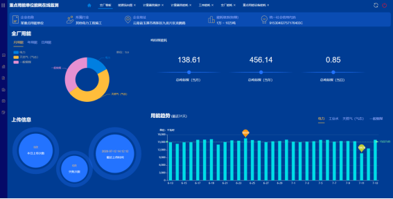 (1)全場看板:全廠看板頁面概要顯示企業的基本信息;全廠用能展示日、月、年消耗能源折算的噸標煤量,同時餅圖展示企業不同能源消費占比情況;用能趨勢展示同分類能耗的逐日用能趨勢;上傳信息顯示重點用能單位上傳情況。