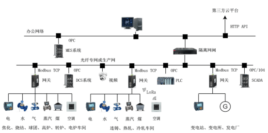 服務層(一般部署在鋼鐵廠機房服務器中)提供數據分析、能源管理、能耗預測、事件報警等功能。