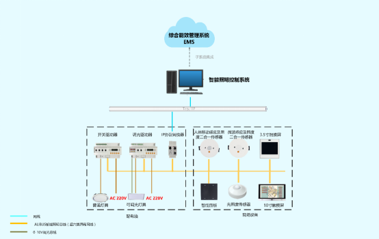 智能照明控制系統根據各個部門的需求,設定不同種類的場景模式,進行各種照明燈光的組合,改化工作環境的效果;結合人體感應傳感器,當人員離開時,關閉該區域照明。