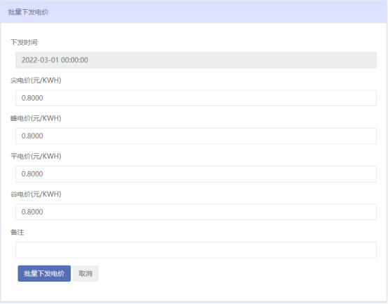 比如12月份的電價能在11月份就知道,這時針對預付費電表就需要在月底調(diào)整電價,在預付費系統(tǒng)中可以批量修改電價,同時一般電價都是在每月1號零點修改,為了方便物業(yè)操作,還可以設置電價下發(fā)時間,到時自動將電價下發(fā)給電表。