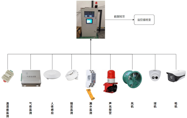 雙氣氣體探測器、溫濕度傳感器、水浸傳感器、煙感傳感器、人體傳感器、球型攝像機以及槍型攝像機。通過物聯網技術將數據上傳,實現對該項目配電室多方位的控制和管理,為配電室安全、穩定、經濟運行提供了堅實的保障。