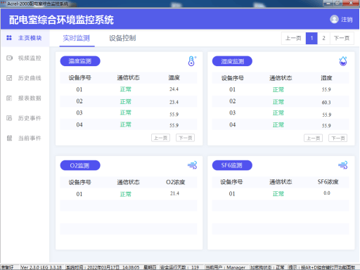 配電室綜合監控系統人機界面友好,能夠顯示配電室設備的運行狀態,實時監測配電室環境參數信息,如視頻、溫度、濕度、漏水/水浸、水位、有害氣體和電參量等,實時顯示有關故障、告警等信息。