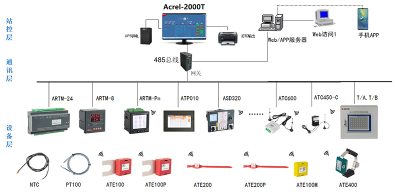 ARTM-Pn無線測溫裝置:ARTM-Pn無線測溫裝置可以單獨安裝在高壓柜、低壓抽屜柜內,每臺裝置可以接收18個傳感器的數據,傳感器型號可選配ATE100、ATE200、ATE300。裝置帶有一路485接口,可將采集到的溫度數據上傳到監控中心。