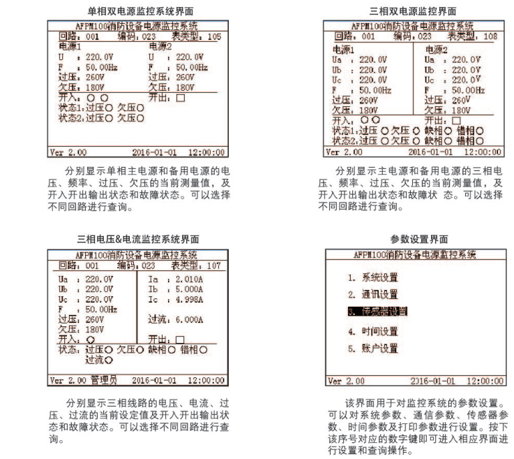 AFPM系列消防設備電源監控系統能夠對消防設備的電源進行實時監控,通過檢測消防設備電源的電壓、電流、開關狀態等有關設備電源信息,從而判斷電源設備是否有斷路、短路、過壓、欠壓、缺相、錯相以及過流(過載)等故障信息并實時報警、記錄的監控系統。此系統具有可靠性、實時性并具有數字化、智能化、網絡化、自動化和連續監控的特性。實時反映出被監控設備電源的狀況,并集中顯示,從而可以有效避免在火災發生時,消防設備由于電源故障而無法正常工作的危急情況,*大限度的保障消防聯動系統的可靠性。