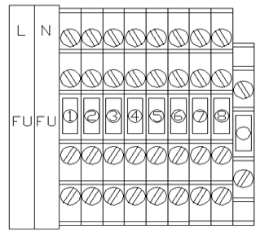 中繼器接線端子置于主機柜內,有8個單排接線端子,其端子接線圖如下圖所示。其中接線端子的接線方式是從上端接線,結合圖示仔細接線。