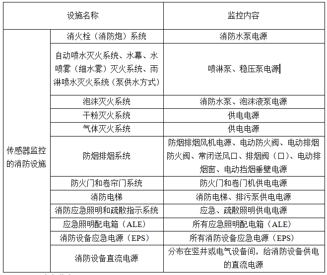 傳感器監測的消防負荷電源應包括但不限于下表: