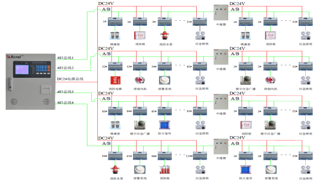 AFPM消防設備電源監控系統由消防設備電源狀態監控器(區域分機)、傳感器、中繼器、系統主機和配套附件組成。