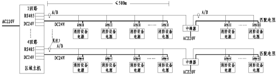 2.傳輸距離大于500m時,需加中繼器,中繼器為現場傳感器提供DC24V電源。中繼器的AC220V電源線采用3*1.5mm2,由現場消防電源或消防監控室監控器提供。